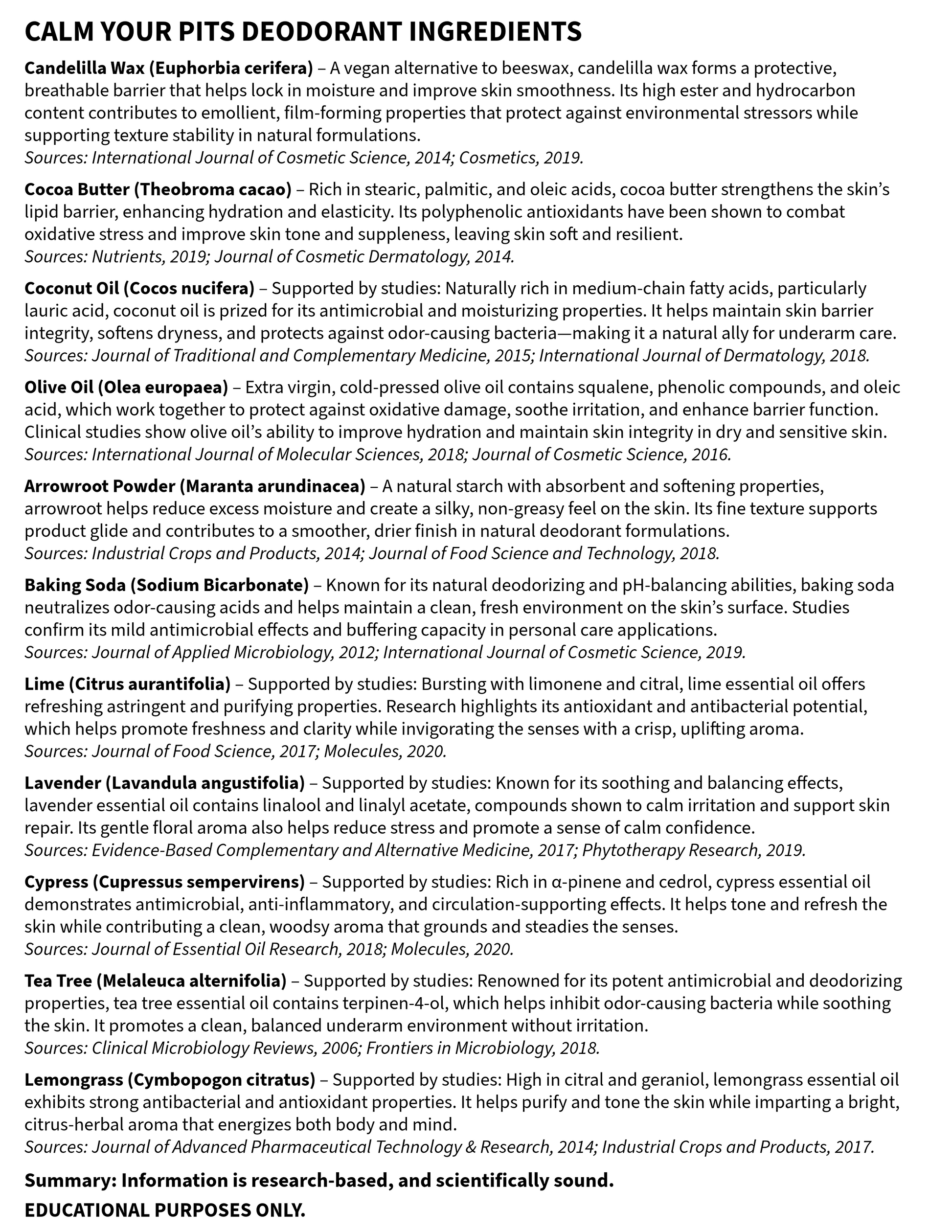 Calm Your Pits Deodorant Ingredients: Pure Plant-Based Candelilla Wax*, All-Natural Cocoa Butter*, Unrefined Coconut Oil*, Unrefined Cold-Pressed Extra Virgin Olive Oil*, Arrowroot Powder*, Baking Soda, and Essential Oils: Lime, Lavender, Cypress, Tea Tree, Lemongrass *ORGANIC