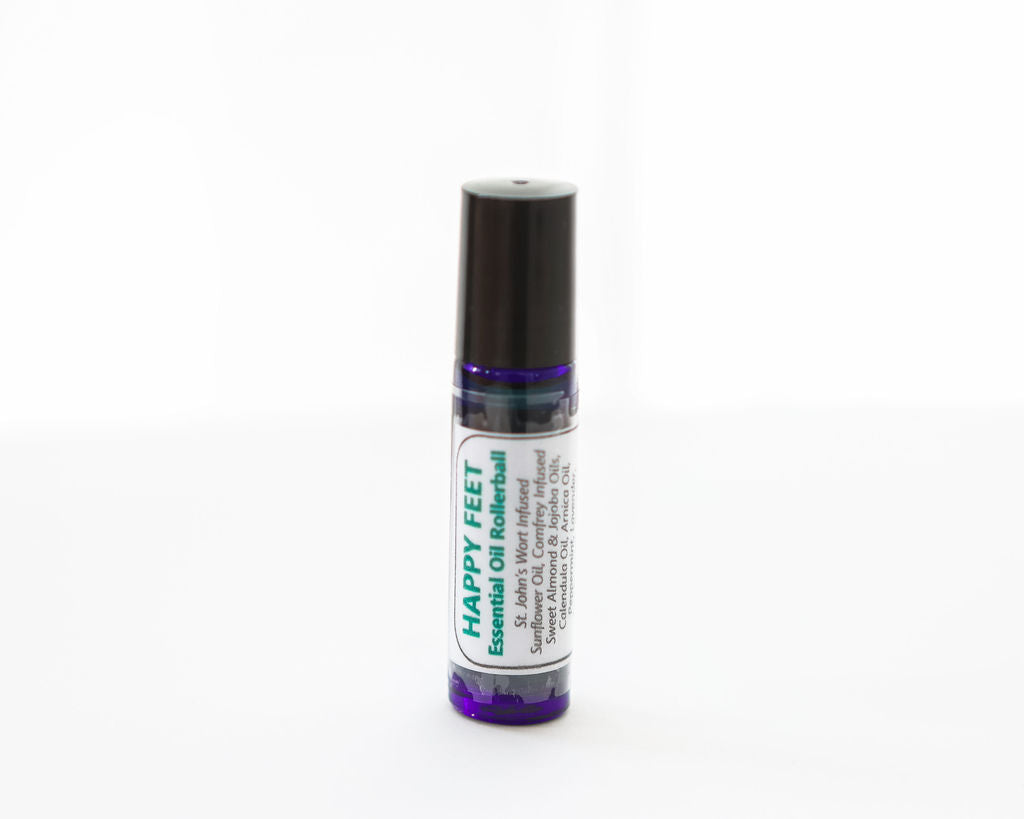 Happy Feet Rollerball Ingredients: St. John’s Wort Infused Sunflower Oil, Comfrey Infused Sweet Almond & Jojoba Oils, Calendula Oil, Arnica Oil, Peppermint, Lavender, Frankincense, Rosemary, Eucalyptus, Ginger Essential Oils
