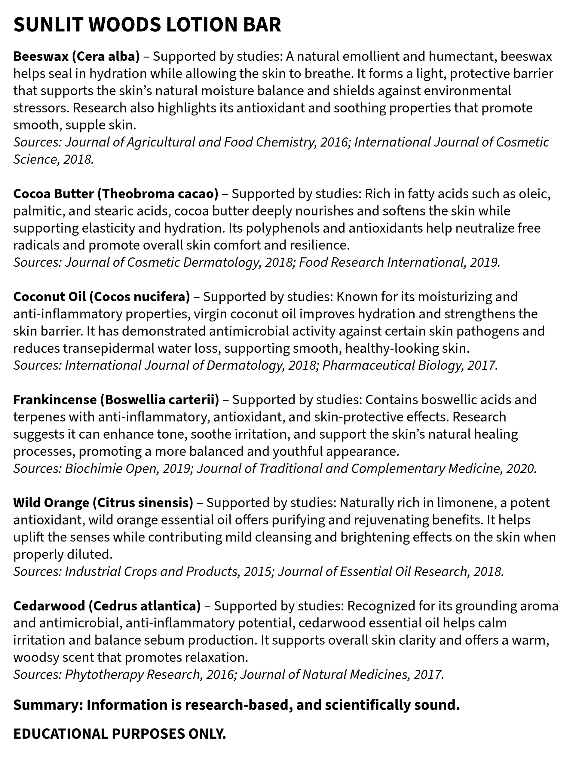 Sunlit Woods Ingredients: Grade A Beeswax*, All-Natural Cocoa Butter*, Unrefined Coconut Oil, and Essential Oils: Frankincense, Wild Orange, Cedarwood *ORGANIC