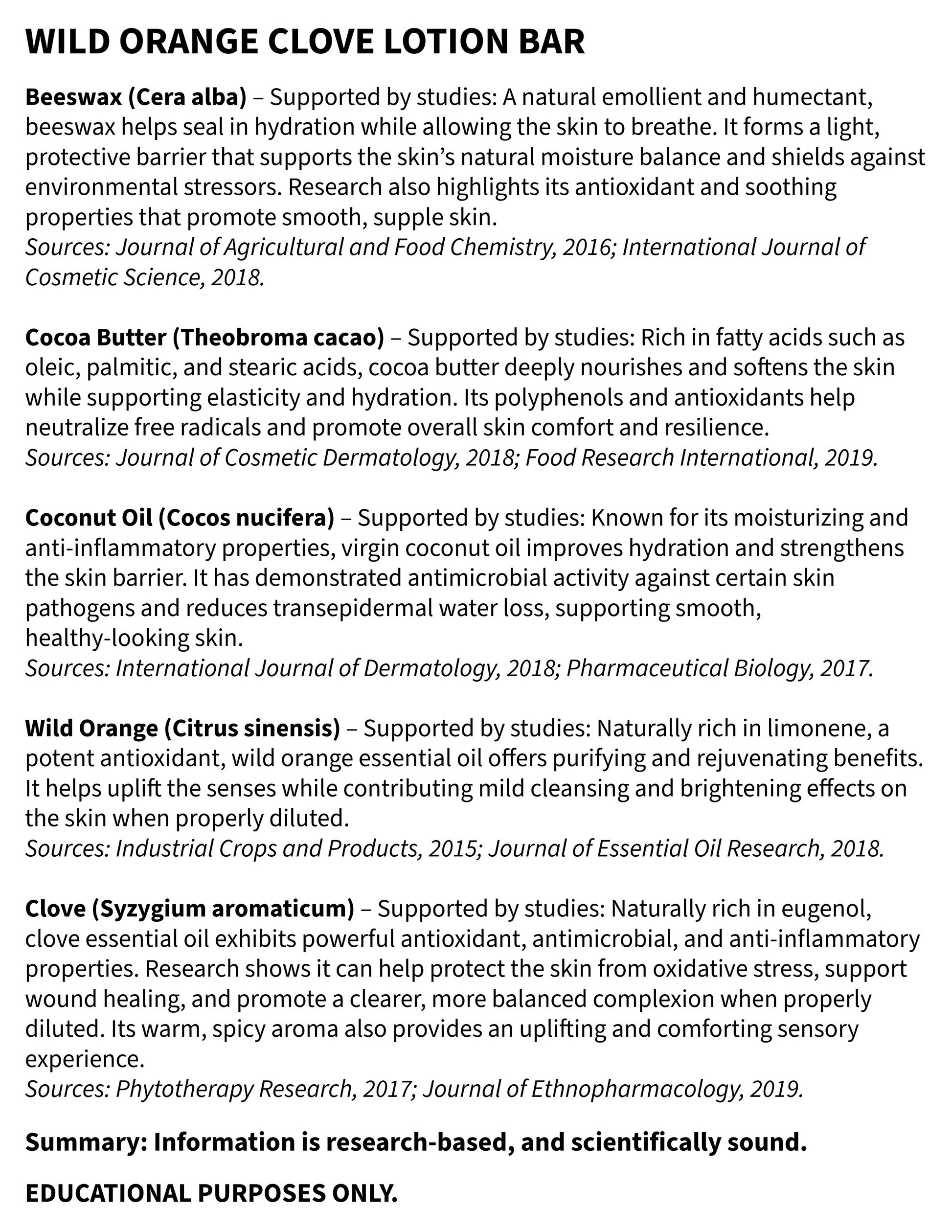 Wild Orange Clove Ingredients: Grade A Beeswax*, All-Natural Cocoa Butter*, Unrefined Coconut Oil, and Essential Oils: Wild Orange, Clove *ORGANIC
